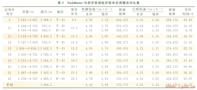 第二階段對(duì)鉆頭進(jìn)行優(yōu)化,配合針對(duì)塔北地區(qū)設(shè)計(jì)的PDC鉆頭U513M在10口井第二次開(kāi)鉆的Æ241.3mm下部井段進(jìn)行了應(yīng)用,應(yīng)用地層為三疊系—奧陶系,平均單井進(jìn)尺1284.5m,平均機(jī)械鉆速和行程鉆速分別為4.44m/h和3.2lm/h,與鄰井同井段應(yīng)用常規(guī)鉆井技術(shù)相比,分別提高170.7%和181.6%;表3為TorkBuster與鄰井常規(guī)鉆井技術(shù)應(yīng)用情況對(duì)比,TorkBuster+U513M技術(shù)提速效果顯著。