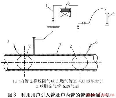 如果兩球之間的管段上連接有用戶,則可利用用戶引入管進(jìn)行管道檢漏(見圖3),充氣和測壓可充分利用用戶引入管及戶內(nèi)管。