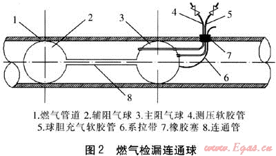 堵球查漏一般都在燃?xì)夤艿纼?nèi)壓力較低,且燃?xì)獠涣鲃?dòng)或流速極小的情況下進(jìn)行。將連通球放置妥當(dāng)后,用球膽充氣軟膠管充入空氣升壓使球膽膨脹,這樣兩球間就形成一個(gè)與兩端隔絕的密閉空間。再用測壓軟膠管向此密閉空間充氣(以氮?dú)獾榷栊詺怏w為宜),達(dá)到一定壓力后,停止充氣。在測壓軟膠管的地面端接U型壓力計(jì)測壓觀察,如果這段空間的管道壁有破損而泄漏,則壓力會(huì)下降。如此移動(dòng)檢查,即可確定泄漏點(diǎn)位置。在查漏實(shí)踐中,這種方法比較實(shí)用,但還有一些弊端和不方便的地方。
