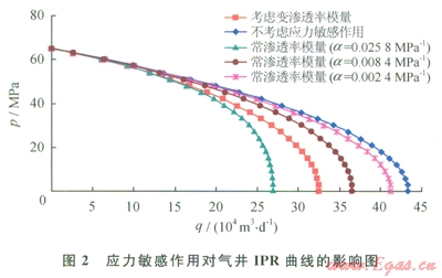 圖2為應(yīng)力敏感作用對氣井IPR曲線的影響,從圖中可以看到,應(yīng)力敏感作用會使氣井的產(chǎn)量降低,特別是在井底流壓較低時,產(chǎn)量降低得越嚴重;對于滲透率模量計算的IPR曲線,在相同的井底流壓下,常滲透率模量越大,氣井的產(chǎn)量越低;對于該氣井用變滲透率模量計算的IPR曲線與用常滲透率模量計算的IPR曲線在形態(tài)上具有相似性,但是當井底流壓較小時,用變滲透率模量計算的產(chǎn)量與用常滲透率模量計算的產(chǎn)量差異較大,由于變滲透率模量更能夠反映儲層的滲流特征,因此用傳統(tǒng)的常滲透率模量計算的產(chǎn)量可能會錯誤估計應(yīng)力敏感作用對氣井產(chǎn)量的影響。