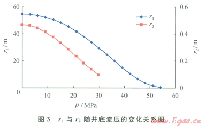 圖3為r1與r2隨井底流壓的變化關(guān)系圖,由于實驗發(fā)現(xiàn)在有效應(yīng)力的變化范圍內(nèi)存在著3段滲透率模量,因此從井眼半徑r3(或rw)到供給半徑r0(或re)之間存在著r2與r1將氣藏在徑向上分為3個區(qū)域,每個區(qū)域由于有效應(yīng)力的不同而呈現(xiàn)出不同的滲透率變化規(guī)律,從圖中看到,當井底流壓小于30MPa時,r1與r2隨著井底流壓的增大都會減小,當井底流壓大于30MPa且小于56MPa時,由于地層中有效應(yīng)力減小,在徑向上則只存在兩個區(qū)域,且分界處r1隨著井底流壓的增大會進一步減小,直到當井底流壓大于56MPa時,則退化為了常滲透率模量的產(chǎn)能模型。