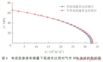 圖4為考慮變滲透率模量下高速非達西對氣井IPR曲線的影響,從圖中可以看到高速非達西效應(yīng)將會使異常高壓氣藏氣井的產(chǎn)量降低,并且隨著井底流壓的減小,高速非達兩效應(yīng)使得氣井產(chǎn)量降低得更嚴重。