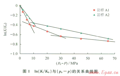 采用擬三軸應(yīng)力巖心夾持器測定該井取樣巖心在不同有效應(yīng)力下的滲透率,發(fā)現(xiàn)在儲層壓力范圍為0~65MPa時,表現(xiàn)為變滲透率模量特征,研究發(fā)現(xiàn)可以用3段滲透率模量來表征滲透率隨有效應(yīng)力變化的關(guān)系(表1)。