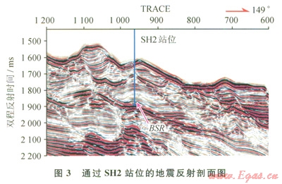 圖3是神狐海域過SH2站位的地震反射剖面,從圖3中可看出,沉積物波表現(xiàn)為席狀波狀相,整體呈長條形或伸長狀席狀外形,厚度較為均一,內(nèi)部同相軸呈不對稱波狀反射結(jié)構(gòu),向上坡方向遷移攀升;在橫切大陸坡的剖面上,呈連續(xù)的波狀或丘狀;其底部有明顯的滑脫面,這是由于底流發(fā)育時(shí)具有較強(qiáng)的侵蝕能力,對早期的沉積物進(jìn)行了簸選改造和再沉積,頻繁的侵蝕界面可能反映r底流的脈動性。剖面上TRACE900~TRACEl 000,BSR之上有一明顯的因速度振幅異常而形成的眼球狀結(jié)構(gòu),是一條比較典型的含水合物層特征的地震剖面。另外,BSR上面有明顯的、連續(xù)性較好的振幅空白帶,極性與海底極性相反。