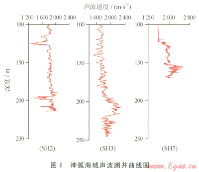 2007年,我國在神狐海域?qū)嵤┝怂衔镢@探,在SH3、SH2和SH7站位成功鉆獲水合物實(shí)物樣品,筆者利用這3個(gè)站位的聲波測井曲線來分析含水合物層的特征。