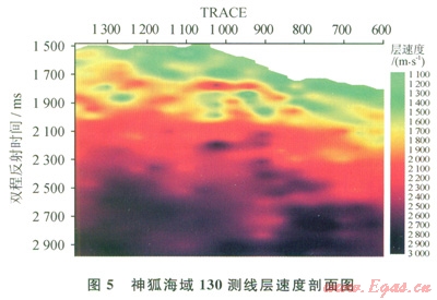 圖5為神狐海域l30測線用Dix公式計(jì)算的層速度剖面。在距海底大約250ms上方附近(地震剖面上解釋為BSR位置),明顯顯示出一段近似平行于海底的相對高速層,高速層上、下都是明顯的低速層。高速層的層速度在1800~2500m/s,其上面低速層的層涑度為1500~1700m/s,而下面的低速層的層速度在l100~l500m/s,有明顯的游離氣存在的低速特征,可以認(rèn)為該測線的相對高速層速度是水合物層的反映。