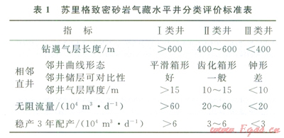 對(duì)于大面積分布的強(qiáng)非均質(zhì)性致密氣田,要實(shí)現(xiàn)對(duì)儲(chǔ)量的規(guī)模動(dòng)用,所需鉆井?dāng)?shù)量多,而且與常規(guī)的整裝氣田不同,不但區(qū)塊間產(chǎn)能差異較大,而且相同區(qū)塊內(nèi)由于儲(chǔ)層的強(qiáng)非均質(zhì)性相鄰的井間產(chǎn)能差異也較大。在開發(fā)早期由于井?dāng)?shù)較少難以確定準(zhǔn)確的平均單井產(chǎn)能,而且單井平均產(chǎn)能也不能反映區(qū)塊內(nèi)相互之間的差異性。宜采用氣井分類評(píng)價(jià)的思路,建立不同類型氣井地質(zhì)模型與動(dòng)態(tài)特征的相關(guān)關(guān)系,一方面可以通過地質(zhì)目標(biāo)的評(píng)價(jià)進(jìn)行產(chǎn)能的初步判斷和氣井分類配產(chǎn),另一方面可根據(jù)不同類型井的鉆遇比例來評(píng)價(jià)區(qū)塊的開發(fā)效果,以使評(píng)價(jià)方法更具靈活性。一般可分為3類井,好井經(jīng)濟(jì)效益明顯,中等井為邊際效益,差井經(jīng)濟(jì)效益差、需要好井來彌補(bǔ)。