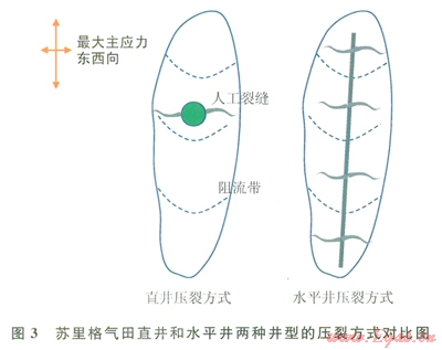 蘇里格氣田直井開發(fā)方式下采收率較低,除了井網(wǎng)控制程度的影響外,阻流帶造成鉆遇砂體動(dòng)用不完善也是主要原因之一,而水平井可以克服“阻流帶”的影響,再通過多段壓裂,可有效提高鉆遇儲(chǔ)層的動(dòng)用程度(圖3)。