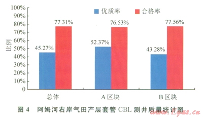 2008年川慶鉆探土庫曼分公司在阿姆河右岸應(yīng)用上述防氣竄固井技術(shù)先期進行了6口井的先導(dǎo)性試驗,提高固井質(zhì)量效果明顯。總結(jié)應(yīng)用試驗結(jié)果后,中國石油川慶鉆探工程公司井下作業(yè)公司對固井技術(shù)做了進一步優(yōu)化,截止到2011年l2月,在39口井中應(yīng)用情況良好,CBL測井質(zhì)量優(yōu)質(zhì)率達到45.27%(圖4),合格率達到77.31%,目前該區(qū)塊環(huán)空帶壓情況由2008年之前的40%下降到目前的6%。