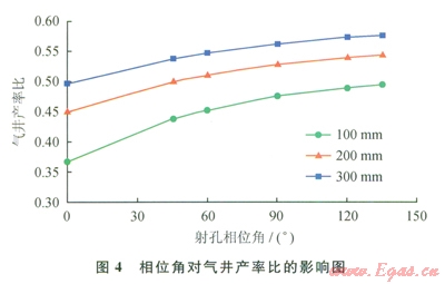 模擬研究認(rèn)為孔密超過l6孔/m時,氣井產(chǎn)能增加幅度有限;相位角對產(chǎn)能的影響很明硅,作為酸壓(化)井,60°和l20°相位角比較合適,120°產(chǎn)能最高(圖4);產(chǎn)能隨孔眼深度的增加而增加,當(dāng)孔深增加到一定程度時,氣井產(chǎn)能增加的幅度明顯變緩;氣井產(chǎn)能對孔徑十分敏感,產(chǎn)能隨孔徑增大增加明顯,在孔眼穿透污染帶以后這種影響更為顯著。
