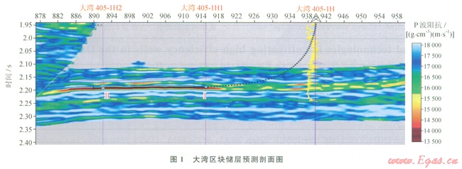總體思路就是優(yōu)選多種地震屬性參數(shù)和有效預(yù)測方法,克服礁灘相儲層埋藏深、地震響應(yīng)弱和地質(zhì)復(fù)雜造成的困難,實現(xiàn)分類預(yù)測儲層的目標(biāo)[3],為“多打高效井”提供了技術(shù)保證。包括:①引入Xu-White模型,在剛性孔隙的基礎(chǔ)上增加微裂縫,擴展到巖石模型中,擬合不同類型儲層的彈性參數(shù),利用交匯圖法確定能夠區(qū)分不同類型儲層的彈性參數(shù);②在合成地震標(biāo)定中,采用井控制下的基于模型的子波相位—幅度譜估算方法,通過多種質(zhì)量控制于段,沿井軌跡方向進行時深標(biāo)定,提高水平井的標(biāo)定精度;③采用三維建模技術(shù),建立大灣區(qū)塊逆斷層地質(zhì)模型,消除斷層附近儲層因?qū)游慌で斐傻念A(yù)測精度低的問題;④利用石灰?guī)r與白云巖的波阻抗差異明顯這一特點,采用高頻濾波技術(shù)建立非均質(zhì)低頻模型,消除儲層非均質(zhì)的影響,定量預(yù)測優(yōu)質(zhì)儲層空間展布特點(圖1)。