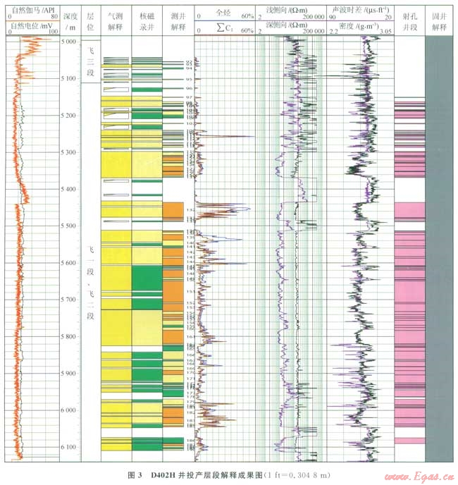 結(jié)合單井井身結(jié)構(gòu)、同井質(zhì)量等因素,具體優(yōu)化氣井投產(chǎn)層段。如D402H井鉆遇氣層750m,含氣井段跨度l055.3m,固井質(zhì)量優(yōu)秀??紤]該井井段跨度大,飛三段氣層有鄰井控制,為降低投產(chǎn)作業(yè)難度和節(jié)約投資,對于氣層相對分散的飛三段氣層(厚度33m,跨度ll0m)不射孔(圖3)。通過投產(chǎn)層段優(yōu)化,在不影響單井產(chǎn)能等開發(fā)指標(biāo)的前提下,合理避射氣層,降低了投產(chǎn)作業(yè)費用。