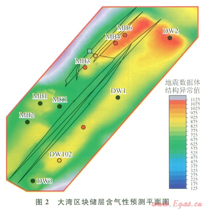 研究認(rèn)為,大灣區(qū)塊存在上下兩套地震數(shù)據(jù)體結(jié)構(gòu)特征異常段,上含氣層為飛仙關(guān)組,下含氣層為長興組,主要呈北東一南西向分布。飛仙關(guān)組預(yù)測有利含氣面積49.0km2,長興組預(yù)測有利含氣面積l3.3km2,全區(qū)為62.3km2。其中DW2和MB4、MB6井區(qū)為l類有利含氣區(qū),是培育高產(chǎn)井有利區(qū)域(圖2)。