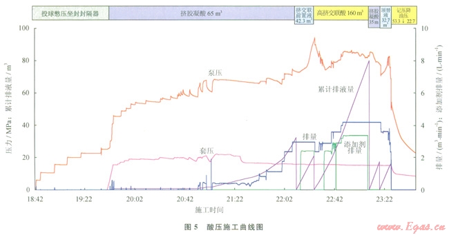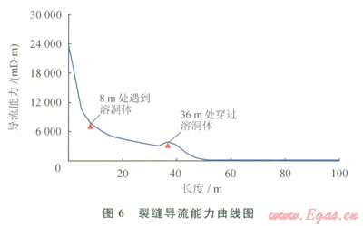 利用實驗確定了典型地質(zhì)體的響應(yīng)特征,以該響應(yīng)特征為依據(jù)對實際井?dāng)?shù)據(jù)進(jìn)行解釋,建立一系列的特征圖集或解釋圖版,在后續(xù)生產(chǎn)中可以用圖版對測井資料進(jìn)行解釋[12-13]。圖4是塔里木油田A井的一段碳酸鹽巖段綜合解釋成果圖。從圖中可以看出XX20~XX30m井段,成像測井在XX26m解釋一條40cm高的裂縫,孔隙度小于1.8%,電阻率大于1000W·m,綜合評價為Ⅲ類儲集層,開井流動曲線呈一條直線,關(guān)井壓力恢復(fù)緩慢,壓力歷史曲線反映測試層為特低滲透性儲集層,僅從常規(guī)分析這類儲集層即使酸化壓裂也不會獲得工業(yè)油氣流。而對應(yīng)遠(yuǎn)探測成像圖上可以看出在XX20~XX28m距井壁3~10m的地方發(fā)現(xiàn)反射信息比較明顯,為雙邊成像,同相軸幾乎為直線,但兩側(cè)的同相軸延長線在在一條線上,裂縫角度較高,根據(jù)圖版可以評價為高角度井旁裂縫。建議中國石油塔里木油田公司勘探公司進(jìn)行試油,該建議被采納,酸壓后6mm油嘴日產(chǎn)氣l0多萬立方米、油l0多立方米。從圖5酸壓施工曲線分析,擠膠凝酸注入過程壓力平穩(wěn)上升,人造裂縫正常延伸,沒有溝通儲層縫、洞的跡象;再次擠膠凝酸后,壓力有明顯下降,說明溝通了縫洞系統(tǒng)。從圖6裂縫導(dǎo)流能力曲線圖上分析在裂縫延伸方向8m處遇到溶洞區(qū),在36m處穿過溶洞區(qū)。證實遠(yuǎn)探測聲波反射波成像解釋是正確的。