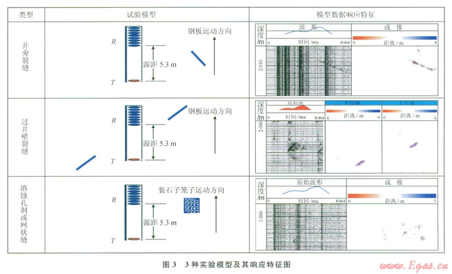 實驗過程中用2m×lm×1mm的鋼板模擬裂縫,用2m×lm×0.5m的鐵制網(wǎng)狀籠子裝上大小不等的鵝卵石模擬溶蝕孔洞,把儀器水平放入水中,保持儀器在水中靜止,模型做勻速運動,記錄一組數(shù)據(jù),據(jù)此做不同類型的模擬實驗,得到各種響應(yīng)特征。圖3是在消聲水池做的3類實驗?zāi)P图捌漤憫?yīng)特征圖。圖中井旁裂縫,鋼板中心位置距儀器3m,與儀器夾角為-20°(逆時針為負(fù),順時針為正),儀器源距為5.3m,從原始波形圖上看,反射波的傾斜同相軸非常明顯,從模型來分析這種情況只有下行波,不存在上行波,因此,在處理過程中波分離后直接進(jìn)行成像,沒有進(jìn)行上下行波分離,得到一組單邊的條帶狀同相軸,其形狀、走勢、夾角與模型基本一致,同相軸的中點大約為3m與鋼板距儀器的距離一致;過井壁裂縫,兩塊一樣的鋼板分別放在儀器兩側(cè)與儀器的夾角為20°,兩塊板中點都距儀器3m,從原始波形上看有兩組不同走勢的反射波,從理論分析這種情況會出現(xiàn)上下行反射波,對其進(jìn)行處理并雙邊成像,可以看出在上下行反射波成像圖上各有一組條帶狀的同相軸,且兩組同相軸在一條直線上;孔洞或網(wǎng)狀縫,用三角鐵焊成2m×1×0.5m的長方形骨架,然后用的鐵絲網(wǎng)把6個面封好,里面裝上鵝卵石來模擬溶蝕孔洞,放置中心距儀器3m,從理論分析這種模型的反射是雜亂無章的,處理過程中在波分離完直接對其進(jìn)行了成像沒有進(jìn)行上下行波的分離,從成像圖上看呈雜亂無章的斑點狀。
