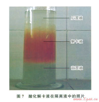 隔離液的作用是將解卡液和鉆井液隔開,防止竄漿,避免引起鉆井液性能變化太大,確保解卡液的酸化效果,通常使用增黏劑來配置,做了隔離液與酸化解卡液配伍性實驗,放置時間為24h[11](圖7),可以看出酸化解卡液與隔離液配伍性較好。