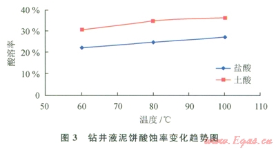 利用酸與巖屑及鉆井液中酸溶性成分反應生成可溶性鹽類的原理,用適當濃度的酸液溶蝕卡住鉆具的巖屑或泥餅,達到解卡的目的。圖1、2、3分別是巖屑、鉆井液泥餅的酸溶評價實驗。