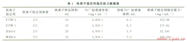 使用鐵離子穩(wěn)定劑的目的是防止酸化后鐵離子形成Fe(OH)3沉淀。評價了4種鐵離子穩(wěn)定劑有效絡合鐵離子濃度能力吲(表1)。
