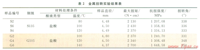 扭轉實驗是按照國家標準GB/T l0128-2007金屬室溫扭轉試驗方法來執(zhí)行。測試S135鋼和G105鋼在鹽酸基液中被腐蝕一定時間后力學性質,即抗扭強度。實驗數(shù)據(jù)見表2所示。