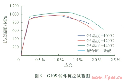 S135鋼、Gl05鋼在拉伸時應變試驗見圖8、9,S135鋼在鹽酸中酸化后的抗拉強度均值為l091MPa(鉆桿APl標準要求S135最小抗拉強度為1000MPa);Gl05鋼在鹽酸介質中酸化后的抗拉強度均值為994.8MPa(鉆桿API標準要求Gl05最小抗拉強度為793MPa)。因此可以看出,Sl35鋼和Gl05鋼在鹽酸中腐蝕后,抗拉強度仍然能滿足工程需要。