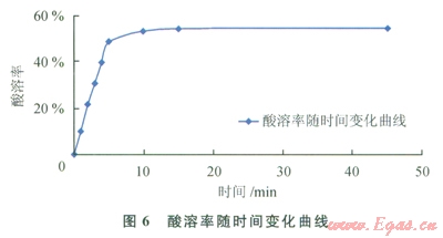 由圖6可知,隨著酸化時間的增加,酸溶率增大,反應l0~15min基本結束,酸溶率可達到54.72%。因此在現(xiàn)場實際的操作過程中,有效酸化時間超過l5min,即可達到酸化解卡的效果。