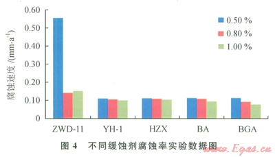 由圖4可以看出,緩蝕劑BGA的緩釋性能最好,加量l.0%時體系的緩蝕率達到了99.72%(15%鹽酸為基液的空白實驗對金屬的腐蝕速率為27.9276mm/a)。結合元壩地層的溫度情況,選取BGA為酸化解卡液的緩蝕劑。