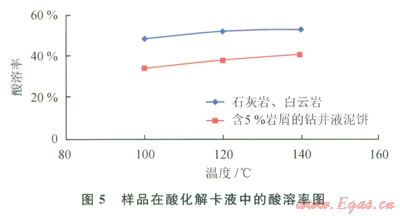 實驗采用了石灰?guī)r、白云巖、含5%巖屑的鉆井液泥餅作為樣品,對酸化解卡液的酸溶性進行了評價,實驗結果見圖5。