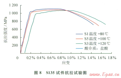 根據(jù)元壩地區(qū)鉆井工程的實際情況,實驗選用了,S135鋼片、Gl05鋼片作為評價對象。一定溫度情況下評價Sl35鋼片、Gl05鋼片在酸化解卡液中腐蝕后強度(抗拉與抗扭)變化情況[12]。