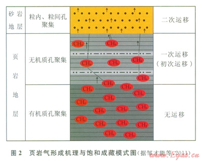 烴源巖排烴后烴類氣體(主要是甲烷)基本無(wú)運(yùn)移或頁(yè)巖層內(nèi)短距離運(yùn)移,屬于“自生自儲(chǔ)”,而常規(guī)天然氣要經(jīng)過(guò)二次運(yùn)移,從生氣層運(yùn)移到儲(chǔ)氣層(圈閉)中聚集成藏(圖2)。
