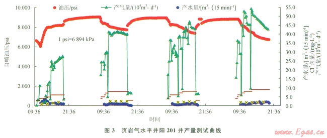 中國(guó)石油天然氣股份有限公司(以下簡(jiǎn)稱中國(guó)石油)已在四川的長(zhǎng)寧、威遠(yuǎn)、富順、永川,云南昭通等開(kāi)展頁(yè)巖氣勘探開(kāi)發(fā)。其中我國(guó)第一口頁(yè)巖氣水平井——威201-H1井于位于四川盆地南部,2011年2月完鉆,井深2835.6m,水平段長(zhǎng)1079m;分11段壓裂,加石英砂584.6m3,入地總液量23654m3,井下微地震監(jiān)測(cè)顯示,初步達(dá)到了規(guī)模體積壓裂的效果,目前日產(chǎn)氣量l3×104m3。中石油與殼牌合作區(qū)塊的水平井陽(yáng)201井,測(cè)試平均日產(chǎn)氣量為45.0×104m3,井口套壓48.3MPa,表現(xiàn)出良好的高產(chǎn)潛力(圖3)。