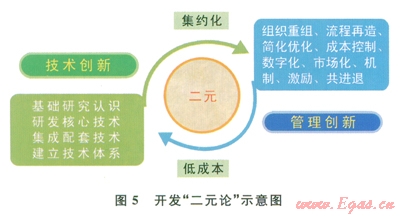 “二元論”是從我國(guó)鄂爾多斯盆地非常規(guī)油氣勘探開(kāi)發(fā)實(shí)踐中總結(jié)形成的成功做法,是指在頁(yè)巖氣開(kāi)發(fā)建設(shè)和技術(shù)攻關(guān)中,技術(shù)創(chuàng)新與管理創(chuàng)新相互結(jié)合,集中配置人力、物力、投資、組織等要素,通過(guò)集成與集約,以較低的成本實(shí)現(xiàn)開(kāi)發(fā)目標(biāo)(圖5)。