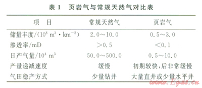 頁(yè)巖氣一般具有“低豐度、低滲透率、低產(chǎn)量”的特點(diǎn),與常規(guī)天然氣相比,屬于典型的“邊緣資源”(表1)。因此,開(kāi)發(fā)頁(yè)巖氣須采用不同于常規(guī)天然氣的理念、思路與技術(shù)。