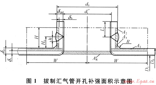 匯氣管開(kāi)口的拔出高度必須大于圓弧過(guò)渡區(qū)的曲率半徑值與接管端部焊接坡口所需的高度之和,其中接管端部焊接坡口所需的高度h=(δnb=1.6)×tg37.5°。另外,由于制造工藝水平不同,不同的制造商對(duì)同樣規(guī)格的主管上開(kāi)同樣直徑的孔,其開(kāi)口接管拔出高度也不盡相同。根據(jù)對(duì)某制造廠拔制工藝水平的咨詢,其拔制工藝為加熱一次拔一次,加熱和拔制的次數(shù)不超過(guò)三次,總共能拔出的高度一般不超過(guò)60mm。