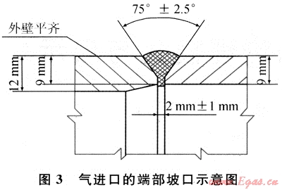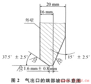 如前所述,在有效補(bǔ)強(qiáng)區(qū)域之外,接管的名義厚度可以取,為了方便與法蘭頸或外部管道對(duì)焊,需要對(duì)支管端部進(jìn)行削邊處理,形成與外部連接的焊接坡口,削邊后的最小厚度不得小于強(qiáng)度要求的名義厚度。氣出口的端部坡口如圖2所示。氣進(jìn)口的端部坡口如圖3所示。