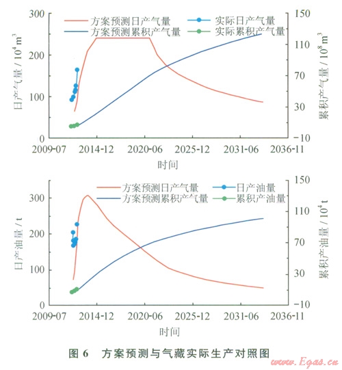 將相態(tài)恢復(fù)研究成果運(yùn)用于氣藏模擬和方案預(yù)測中,氣井的產(chǎn)氣量、產(chǎn)油量、井l:3壓力等關(guān)鍵生產(chǎn)指標(biāo)能夠得到較好擬合,在此基礎(chǔ)上建立氣藏預(yù)測模型預(yù)測氣藏產(chǎn)量,產(chǎn)氣量和產(chǎn)油量與實際吻合程度較高,油氣比基本吻合(圖6),高壓物性實驗、常規(guī)凝析氣藏類型判別與生產(chǎn)靜動態(tài)特征相結(jié)合的氣藏類型判別方法和相態(tài)恢復(fù)理論確定的氣藏類型是正確的、預(yù)測的凝析油含量是可靠的。