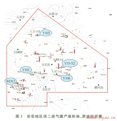 結(jié)合傳統(tǒng)與室內(nèi)實驗判斷結(jié)果綜合分析安岳地區(qū)須二段氣藏為飽和凝析氣藏,由于儲層的非均質(zhì)性導(dǎo)致了局部有少量原油存在,即使個別井口可能會出現(xiàn)開井初期產(chǎn)出大量原油的現(xiàn)象,但是隨著生產(chǎn)的進(jìn)行,原油產(chǎn)出量也會迅速下降,由此,將安岳地區(qū)須二段氣藏類型確定為帶“油墊”的飽和凝析氣藏。從成藏的角度看,可能由于致密強(qiáng)非均質(zhì)氣藏中原油的差異聚集或原油的裂解,致使局部存在少量原油。