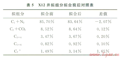 根據(jù)相態(tài)恢復(fù)理論,利用數(shù)值模擬軟件Eclipse中的高壓物性分析模型(PVTi),選取取樣時間早、相平衡較好的Xl2井的高壓物性實驗數(shù)據(jù)進(jìn)行相態(tài)恢復(fù)。首先,對原始PVT數(shù)據(jù)進(jìn)行模擬形成臨界參數(shù)場;然后,在目前壓力下,向平衡凝析氣中逐漸加入少量平衡油,再計算露點壓力,若計算的露點壓力低于地層壓力,則繼續(xù)在新的露點壓力下加入該壓力下的平衡油,直到露點壓力恢復(fù)到原始地層壓力?;謴?fù)到原始地層壓力下的流體組分,可以代表原始?xì)獠貤l件下的流體。相態(tài)恢復(fù)前后對照表表明,相態(tài)恢復(fù)后潛在凝析油含量C5+提高了1.75%,凝析油含量達(dá)到2499/m3(表5)。通過相態(tài)恢復(fù)模擬飽和凝析氣藏地層流體高壓物性特征,為開發(fā)技術(shù)政策制定和氣藏動態(tài)預(yù)測奠定了基礎(chǔ)。