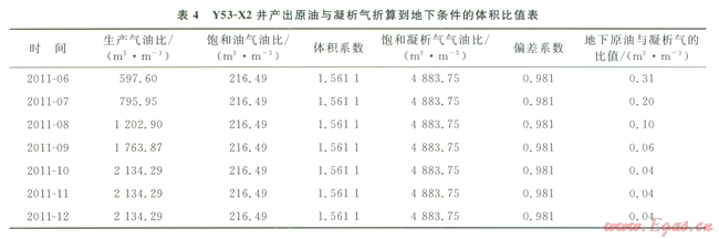 選取產(chǎn)油量最高的Y53-X2氣井進(jìn)行分析,該井投產(chǎn)第一個月,平均日產(chǎn)氣2.04×104 m3,平均日產(chǎn)油35.27t,油氣比達(dá)到l7.29t/104m3,產(chǎn)出油密度0.8055g/cm3,含蠟量l3.63%,屬于原油。在實驗室測得Y53-X2井原始地層條件下飽和油的氣油比為216.49m3/m3,飽和凝析氣氣油比為4883.75 m3/m3,結(jié)合實際生產(chǎn)過程中產(chǎn)出流體的油氣比,計算該井不同時間產(chǎn)出天然氣與產(chǎn)出原油在地下的體積比(表4),結(jié)果表明產(chǎn)出流體中原油的比例迅速降低,表現(xiàn)為局部聚集原油的特征。Y53-X2井采氣曲線也表明隨著生產(chǎn)的進(jìn)行,產(chǎn)出原油迅速下降,該井投產(chǎn)279d后,氣產(chǎn)量基本保持2×104m3/d,油產(chǎn)鰱從初期的45t/d降至2.0t/d(圖5),油產(chǎn)量及油氣比迅速下降,同樣說明井底附近原油有限。
