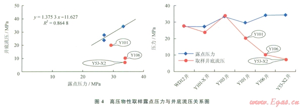 飽和凝析氣藏在分離器取樣進(jìn)行PVT實驗,由于部分重質(zhì)組分的丟失,通常表現(xiàn)出露點壓力與井底流壓呈線性關(guān)系。安岳地區(qū)須二段氣藏的WDl2、X12、Yl03井取樣壓力與實測露點壓力呈線性關(guān)系,且擬合相關(guān)性較好,R2=0.8648;而Yl01、Yl06和Y53-X2井則表現(xiàn)出過剩油的特征(圖4)。因此,該氣藏為飽和凝析氣藏是可以肯定的,是否就像傳統(tǒng)方法判斷的那樣具有“油環(huán)”,還需進(jìn)一步論證。