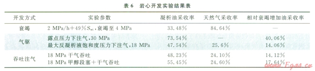 凝析氣藏通常的開采方式主要有衰竭式開采、循環(huán)注氣(露點壓力以上注氣和露點壓力注氣)以及單井吞吐[8-10]。實驗及理論研究證明多孔介質(zhì)中凝析油的采收率高于PVT筒高壓物性實驗[11-13]。因此采用室內(nèi)巖心物理模擬實驗優(yōu)選合理開發(fā)方式,結(jié)果表明在氣藏平均束縛水飽和度為49%,廢棄壓力為4MPa條件下,采用衰竭式開發(fā),凝析油采收率能夠達(dá)到33.48%,天然氣采收率為84.64%,在露點壓力以上注氣,能夠提高凝析油采收率40.06%,在反凝析液飽和度最大壓力下注氣,能夠提高凝析油采收率l4.06%,單井干氣吞吐和加甲醇段塞的單井干氣吞吐,分別提高凝析油采收率14.12%和l7.64%(表6)??紤]安岳地區(qū)須二段氣藏為低孔、低滲的砂巖氣藏,非均質(zhì)性強(qiáng),不建議采用循環(huán)注氣的開采方式,另外加甲醇段塞雖然能夠解除水鎖,降低氣液的界面張力,提高氣相相對滲透率[14],但是考慮到注入成本以及后期的處理,建議單井采用先衰竭后干氣吞吐的開采方式,可提高凝析油采收率,達(dá)到效益開發(fā)的目的。
