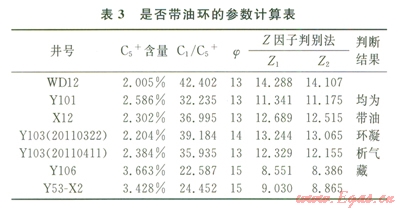 傳統(tǒng)氣藏類型判斷方法有相圖法[3]和經(jīng)驗法,其中經(jīng)驗法又有4種[2]之多。根據(jù)8個樣品擬合的相圖判斷,除2口氣井(Y106和Y53-X2)具有飽和凝析氣藏的特征外,其余樣品均只表現(xiàn)出凝析氣藏的特征(圖2、3);根據(jù)經(jīng)驗判斷法,各井均為凝析氣藏,且四參數(shù)法、j1參數(shù)法、含氣系數(shù)與C2+含量關(guān)系法均判斷Yl06和Y53-X2井為飽和或者帶“油環(huán)”的凝析氣井(表2)。根據(jù)4種專門判斷是否帶油環(huán)的常規(guī)經(jīng)驗法,安岳地區(qū)須二段氣藏7口井均為帶“油環(huán)”或者帶“大油環(huán)”的凝析氣藏(表3)。實際上,安岳地區(qū)須二段氣藏產(chǎn)原油井位置、層段與構(gòu)造和海拔無關(guān),尚未發(fā)現(xiàn)明顯的油氣界面,常規(guī)方法判斷氣藏類型與實際存在差異。