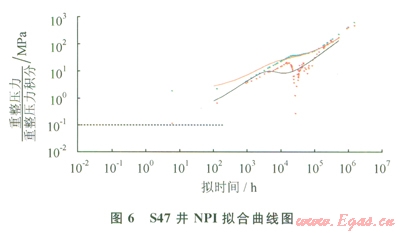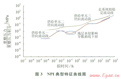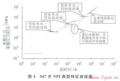 此外,S47井典型曲線分析也表明(圖4),該裂縫系統(tǒng)存在多個儲集體,不同連通范圍在NPI曲線上均有特征反映,且明顯可以發(fā)現(xiàn)由于地層水侵影響,造成NPI導數(shù)曲線異常下掉,與前面理論研究認識一致。