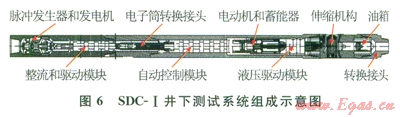 中國石油大慶鉆探工程公司鉆井T程技術研究院于2009年5月研制完成了SDC-I型隨鉆地層壓力測試器[16],并進行了6口井的現(xiàn)場試驗,收到了較好的效果。該測試器分為井下測試系統(tǒng)、地面信息接收及處理系統(tǒng)兩部分。井下測試系統(tǒng)(圖6)負責完成地層壓力的測試并存儲和上傳數(shù)據(jù),地面信息接收及處理系統(tǒng)負責對數(shù)據(jù)進行接收和處理?,F(xiàn)場試驗表明,該測試器設計合理,可靠性高,壓力測量精度達到0.1%,溫度測量精度達到±0.5℃,井下供電功率達到l60W??呻S鉆實現(xiàn)數(shù)據(jù)上傳和井下存儲功能,地面可隨鉆獲取井下準確的環(huán)空壓力、溫度、地層壓力和地層流度(地層流度表示流體在該地層中流動的難易程度。是油層有效滲透率與流體黏度的比值)。經(jīng)過一年半的推廣,SDC-I目前共完成12口井的現(xiàn)場測試工作,井下測試最高壓力47.02MPa,最高溫度109.7℃。這種測試器已初步具備商業(yè)化應用的條件[17]。