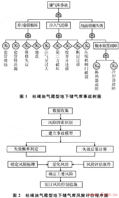 枯竭油氣藏型地下儲氣庫的安全問題至關(guān)重要,其風險是多方面的,與儲氣庫的規(guī)劃、設(shè)計、施工、運營、維護以及檢修的各過程密切相關(guān)。因此必須從系統(tǒng)安全的角度出發(fā),在儲氣庫事故資料統(tǒng)計分析的基礎(chǔ)上,借鑒輸氣管道風險評價方法,結(jié)合儲氣庫特點對系統(tǒng)中潛在風險因素進行初步分類,將其劃分為12大類、33小類,并建立事故樹進行主要風險因素識別,進一步利用事故模型判斷系統(tǒng)發(fā)生事故的可能性及其危害程度,確定其風險大小,建立相應(yīng)的風險評價程序,為制訂風險防范措施和安全管理決策提供科學依據(jù)。