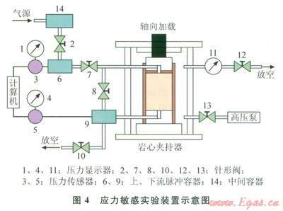 目前應(yīng)力敏感實驗裝置如圖4所示,巖心徑向加圍壓方向與橡膠筒接觸,軸向上通過剛性柱塞加流體壓差[1,14-16]。
