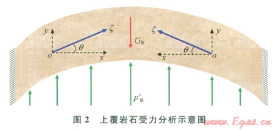 對上覆巖層進行力學(xué)分析(圖2),上覆巖層可以通過巖石的本身抗彎、抗剪的內(nèi)力平衡巖石自身的重力,巖石的內(nèi)力可以分解為水平方向與垂直方向的力,垂向上的分力,巖石的重力Pv=ζsinθ=GR、巖石內(nèi)力以及下方的支撐力在垂向上滿足關(guān)系式: