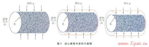 這種實驗裝置的誤差在于巖心在由橡膠制成的巖心套中受壓變形,如圖5所示,流體壓力P1>P2>P3,而巖心的圍壓始終為P保持不變,導(dǎo)致巖心尺寸在實驗過程中發(fā)生較大改變P1>P2>P3。在真實儲層中由于上覆巖層的內(nèi)力可以屏蔽大部分的上覆壓力,上覆壓力不會直接作用于有效儲層中,而試驗中的圍壓是恒定不變的加在橡皮套筒上,而橡皮套筒抗彎性很弱,導(dǎo)致巖心所受到的壓力很大。因此,目前的實驗結(jié)果夸大了應(yīng)力敏感的影響。