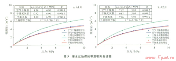 蘭氏體積反映了煤的最大吸附能力,蘭氏壓力反映煤層氣解吸的難易程度,值越高,煤層中吸附態(tài)氣體脫附越容易,越有利于開(kāi)發(fā)跚。從Al、A2井的等溫吸附曲線上看(圖3),潮水盆地煤的蘭氏體積為7.46~10.92m3/t,對(duì)煤層氣的吸附能力強(qiáng);而蘭氏壓力介于5.95~6.90MPa,值較高,利于煤層氣的解吸。