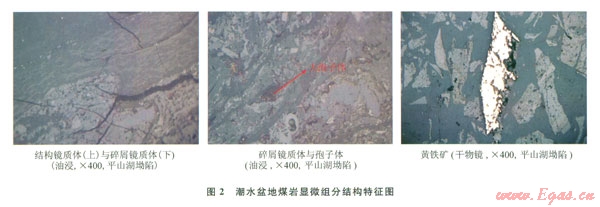 潮水盆地宏觀煤巖類(lèi)型以暗淡煤半晴煤為主。偏光顯微鏡下觀察(圖2),該區(qū)煤層惰質(zhì)組含量偏高,在成煤母質(zhì)器官或細(xì)胞的胞腔內(nèi)填充有黏土礦物,并含有黃鐵礦、石英、黏土等礦物,反映了當(dāng)時(shí)成煤環(huán)境比較復(fù)雜多變。煤巖鑒定分析表明,該區(qū)煤層鏡質(zhì)組含量介于29.0%~89.5%、平均為52.5%;惰質(zhì)組含量介于10.9%~55.2%、平均為38.9%;殼質(zhì)組含量偏高,為l.1%~l4.5%。