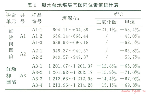該區(qū)宏觀煤巖類(lèi)型以暗淡煤和半暗煤為主,顯微煤巖組分鏡質(zhì)組含量低,生氣母質(zhì)條件較差;煤巖變質(zhì)程度低,為低煤階,熱成因氣量少,因此低煤階煤層氣成藏須要生物氣的補(bǔ)充。目前,國(guó)內(nèi)外學(xué)者普遍采用甲烷碳同位素值(δ13C1)來(lái)鑒別生物氣[9-11]。l989年,戴金星通過(guò)研究我國(guó)生物氣的氣組分及同位素組成特征,提出以δ13C1<-55‰作為鑒別生物氣的主要地化指標(biāo)[12]。